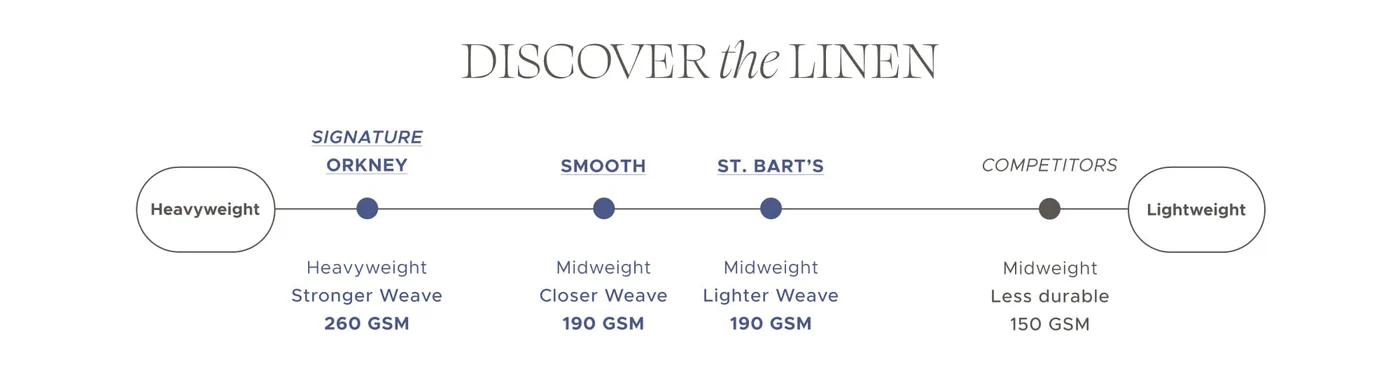 Run your hands across our heritage 100% European flax linens, and you'll feel the resilience and invigorating texture woven into every inch. Expertly crafted with meticulous stitches and seams that hold, with our signature Orkney linen boasting a weight of up to 260 GSM, our fabric far surpasses most offerings on the market.